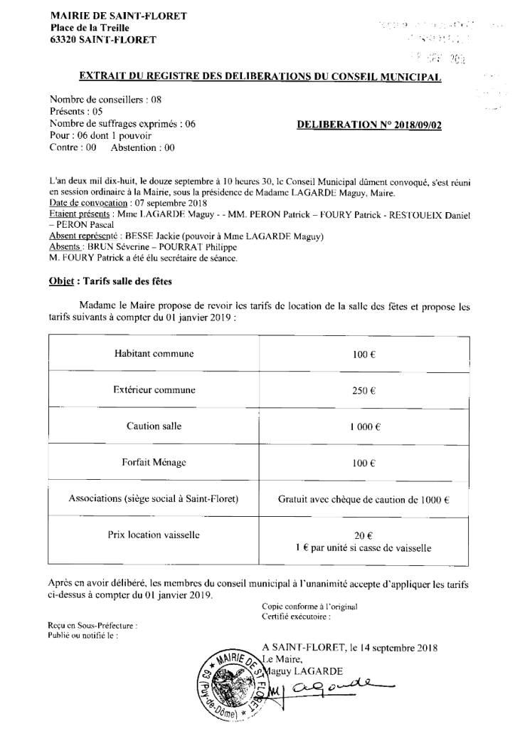 La Salle des fêtes peut servir aux habitants de la Commune pour leurs fêtes mais peut aussi être louée à des personnes extérieures à la Commune. Pour en connaître les modalités, veuillez téléphoner au Secrétariat de la Mairie tel : 04 73 71 10 39 ou envoyer un mel : saintfloret@orange.fr